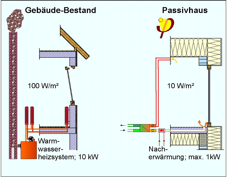 Im Gebäudebestand (Häuser vor 1980) werden immer noch etwa 220 kWh/(m²a) für Raumwärme verbraucht. Nach zahlreichen Novellen und Verschärfungen der Wärmeschutz- bzw. Energieeinsparverordnung ist dieser Wert für Neubauten nach 2009 auf etwa 80 kWh/(m²a) gesunken. Zusätzlich werden etwa 28 kWh/m² für die Warmwasserbereitung und 32 kWh/m² für den gesamten Haushaltsstromverbrauch (ohne Heizung) eingesetzt. Bei einem Passivhaus ist der jährliche Energieverbrauch für Raumheizung auf weniger als 15 kWh/(m²a) reduziert – das entspricht einer Einsparung von über 90% gegenüber dem Gebäudebestand. Darüberhinaus ist aber auch der Verbrauch für die Warmwasserbereitung und der Haushaltsstromverbrauch verringert. Insgesamt lautet die Zielsetzung, den gesamten Endenergieverbrauch für alle Haushaltsanwendungen um 75% zu reduzieren.